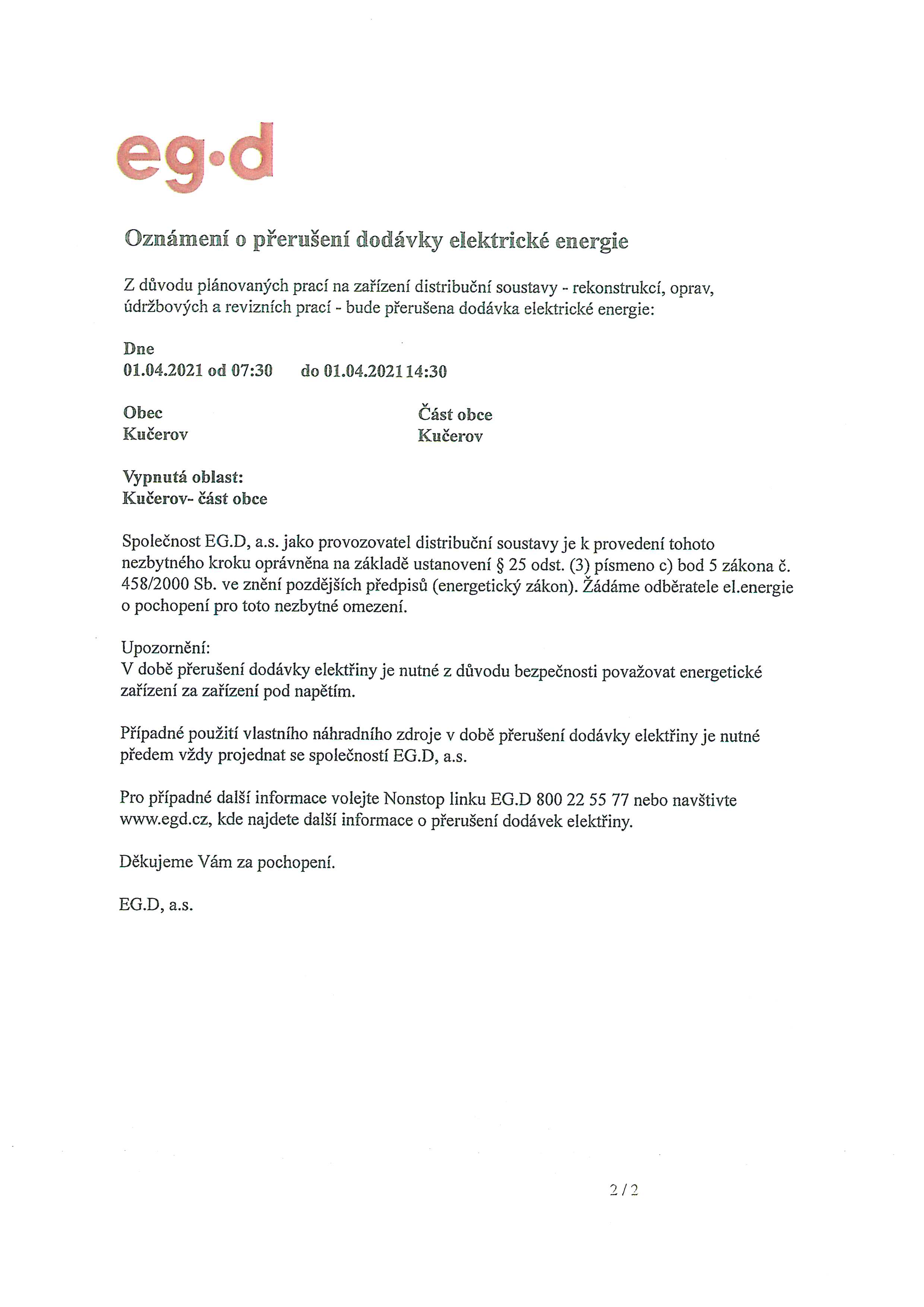 Dne 1. 4. 2021 dojde k vypnutí el.energie v části obce Kučerov.