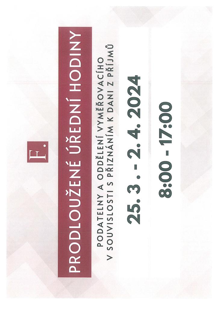 Oznamujeme občanům, že POPLATKY ZA KOMUNÁLNÍ ODPAD, ZA PSA A NÁJMY POZEMKŮ se budou vybírat v pondělí 9.2.2026 v době od 8:30 do 11:00 a od 14:00 do 17:30 hod.