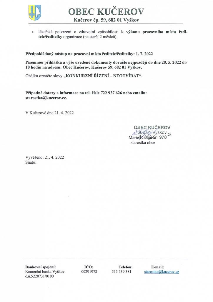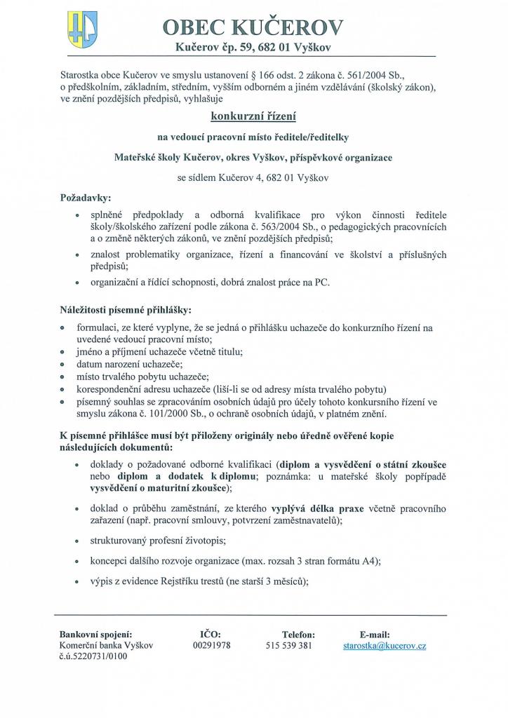 Konkurzní řízení - ředitel/ka MŠ Kučerov