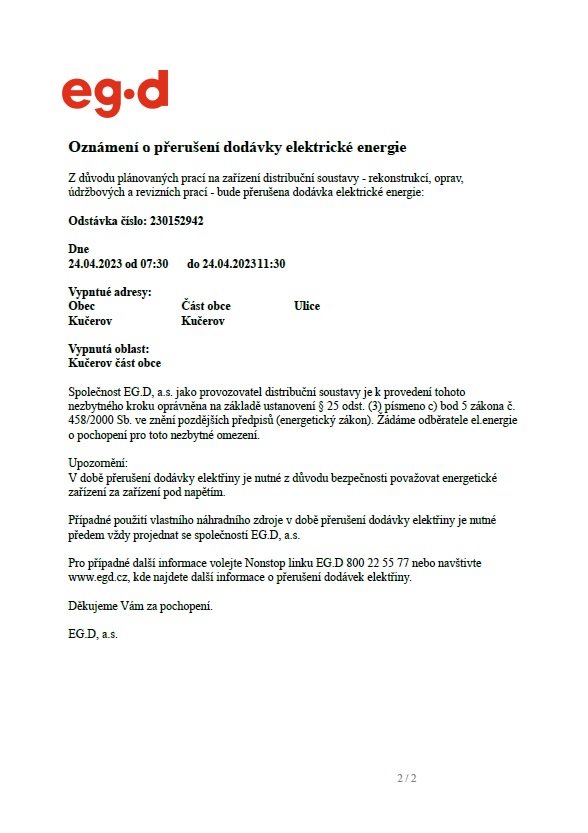 Oznámení o přerušení dodávky elektrické energie - 2. část